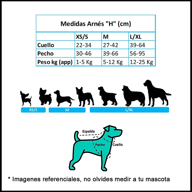 LOS KILOS E IMÁGENES DE LA TABLA DE MEDIDAS SON REFERENCIALES, POR FAVOR MIDE A TU MASCOTA