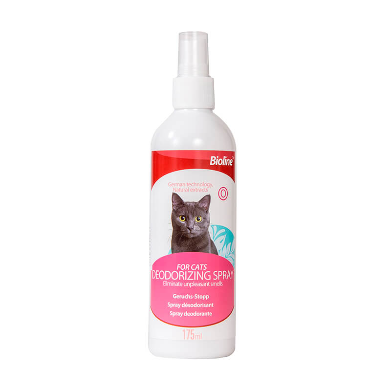 El desodorante para gatos en spray de Bioline es un excelente producto del cuidado de tu mascota, es para uso en el cuerpo y en ambiente. Es amigable con el medio ambiente. Puedes usar este producto para el baño de tu gato o en cualquier lugar en el que se encuentre tu amigo. Remueve los olores indeseados.  Está hecho con ingredientes de alta calidad y seguros para el gato.