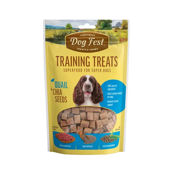 DogFest Training Snack – Codorniz y Semillas De Chia son premios pequeños, sabor a codorniz y semillas de chía, ideales para el entrenamiento. Masticables, fáciles de romper en pedazos más pequeños, siempre son útiles para premiar a tu cachorro ante cualquier buen comportamiento o entrenamiento.