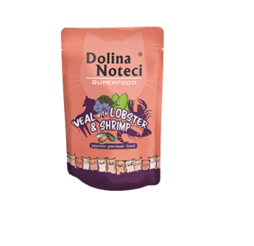 La comida húmeda Dolina Noteci Superfood para gatos combina tipos seleccionados de carne y mariscos: ternera, pollo, langosta y camarones, así como aditivos funcionales únicos. Las semillas de mejillón verde de Nueva Zelanda, espirulina, menta, linaza y fenogreco