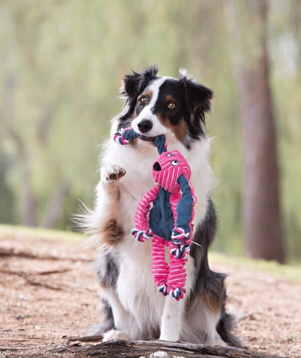 KONG® Floppy Knots Bunny es un juguete con forma de peluche de conejo que contiene una gran variedad de texturas. Tiene cuerdas anudadas en el interior que le da una sensación realista y que se extienden hacia afuera haciendo que tenga una especie de asas, especiales para tironear y halar sin que este se dañe. Este diseño único tiene una variedad de texturas y resistencia que los peluditos aman y además, viene con chillidos que solo producen mayor diversión.