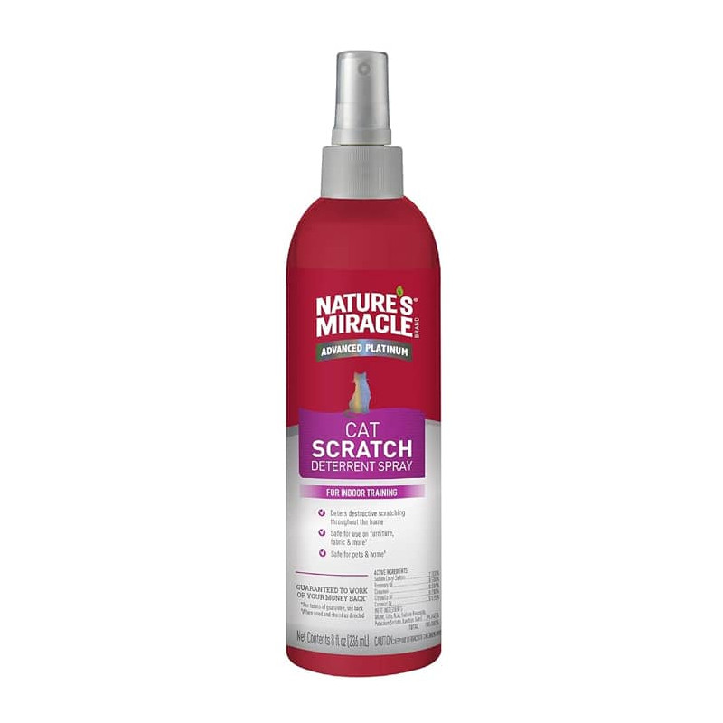 Rascarse es un comportamiento instintivo del gato. Las uñas de los gatos tienen glándulas que dejan un olor cuando rascan, lo que hace que los gatos marquen su territorio. Nature’s Miracle Scratching Deterrent Spray contrarresta este olor y desalienta el comportamiento repetitivo de rascado destructivo. Es seguro usar para mascotas y en el hogar, cuando se usa según las indicaciones.