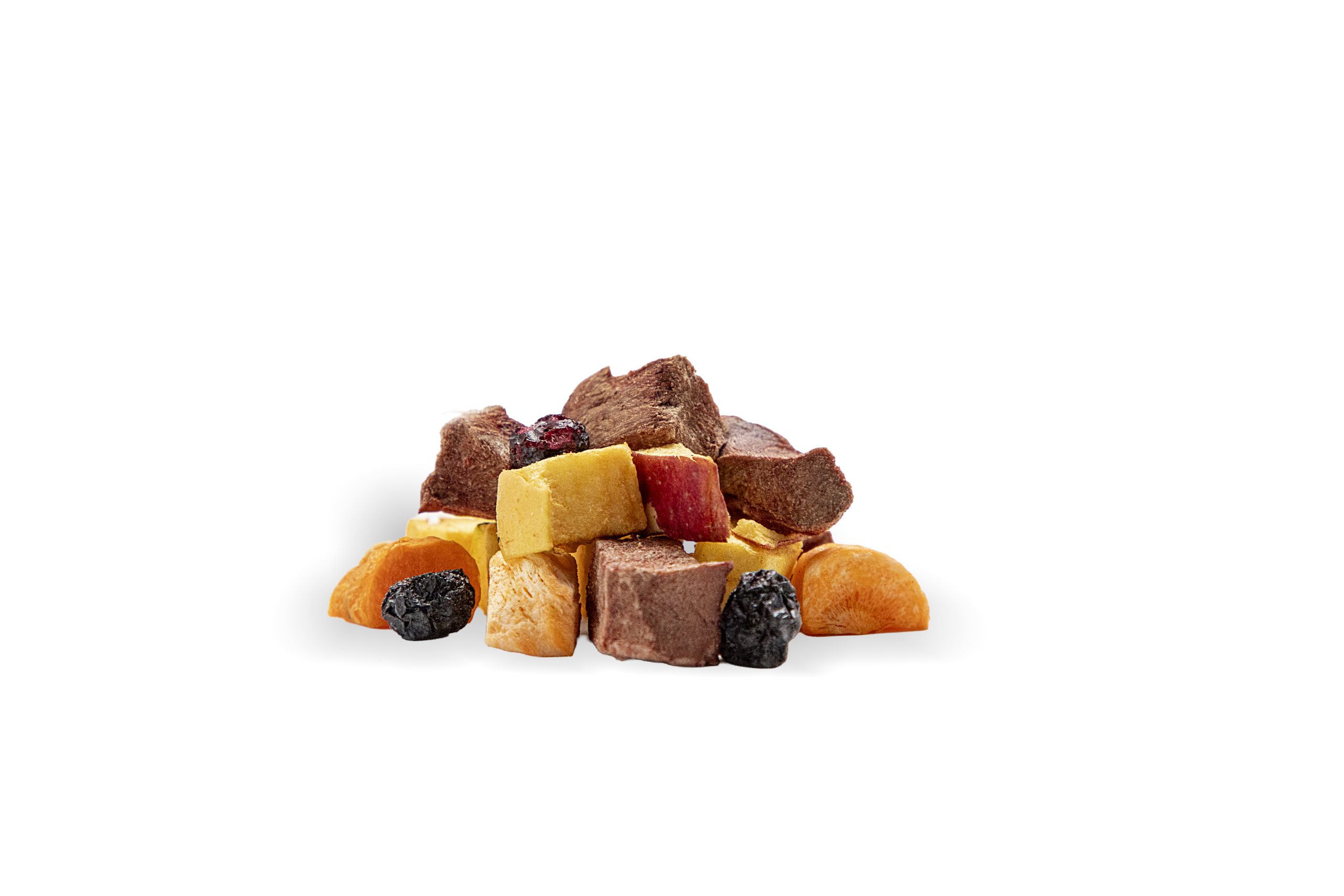 Trozos pequeños de Vacuno y frutas, ideales para entrenar y premiar.
